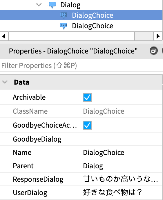 ③DialogにDialog Choiceを追加して、UserDialogに質問、ResponseDialogに質問への返答を書けるよ
