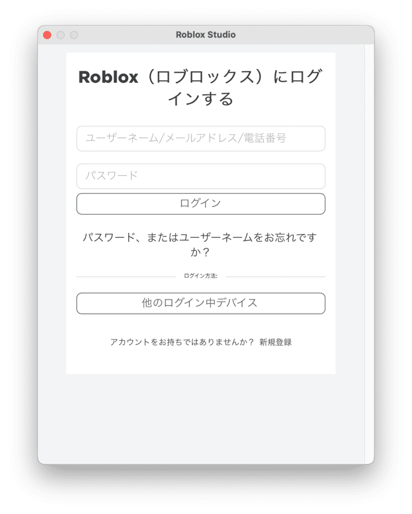 - ロブロックスのアカウントでロブロックススタジオにサインインします。アカウントをお持ちでない場合は、「新規登録」で作成してください。アカウントを保護する方法のヒントについては、「アカウントを安全に保つ 」を参照してください。