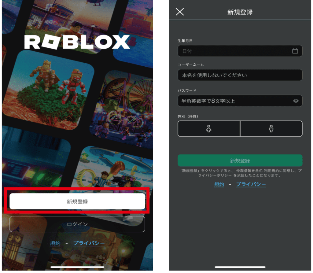新規登録をタップして、生年月日やユーザネームなどを登録しよう!
