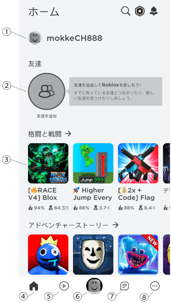 ③は、ロブロックスの人気ゲームがタイル表示されてるよ。タップするとゲームできるよ。