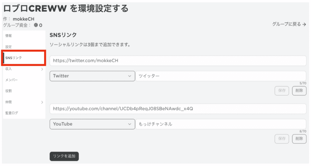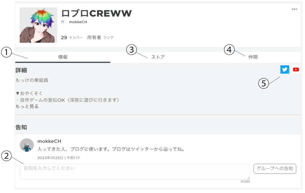 ①は、グループ名。グループを作成後にグループ名を変更する場合は、100ロバックスが必要だから気をつけよう。