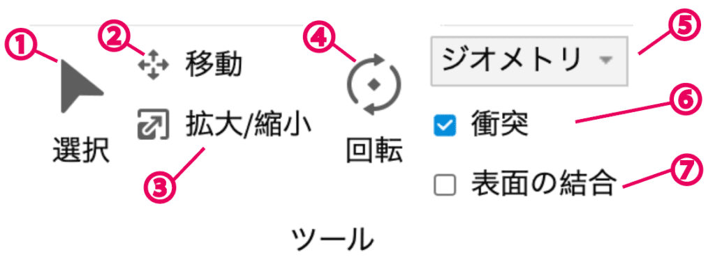 ③は、パーツを「モデルとしてグループ化」したり、「フォルダとしてグループ化」することが出来るので、ひとまとめにすることが出来るよ。ひとまとめにすることで、パーツを管理しやすくなったり、まとめて移動できるようになるよ。