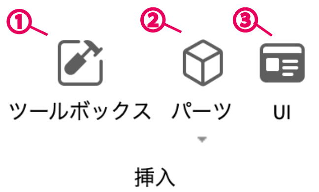 ①は、ツールボックスでロブロックスのゲーム作成のために用意された様々なものが用意されているよ。用意されたものを活用してゲーム作成しよう。