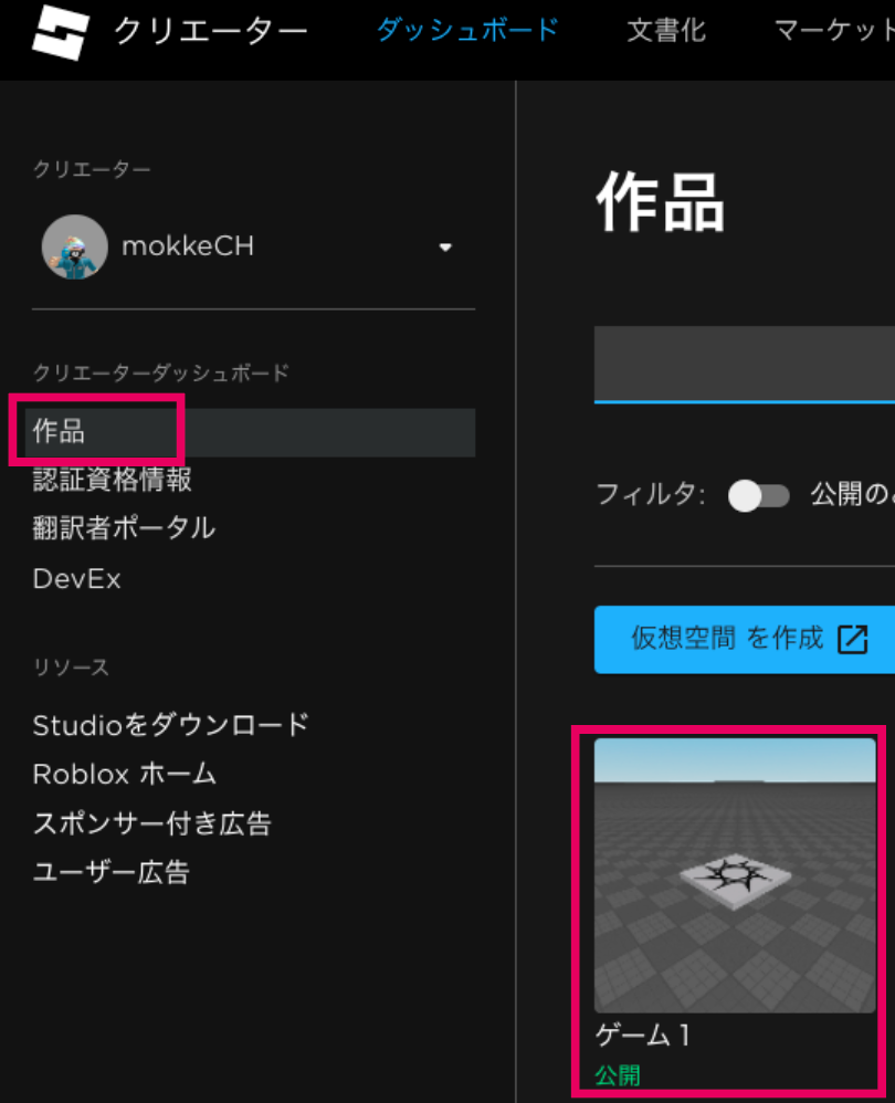 ②ダッシュボードの作品からマップを追加したゲームを選択しよう。