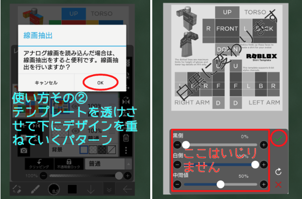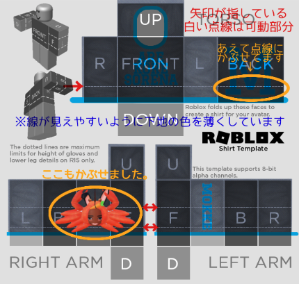 テンプレートにある「白い点線」は可動部分になるので崩れてほしくない絵柄は入れないほうがいいかも。