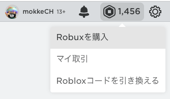 ロブロックスにログインし、右上のRobuxアイコンから「Robuxを購入」を選択します。