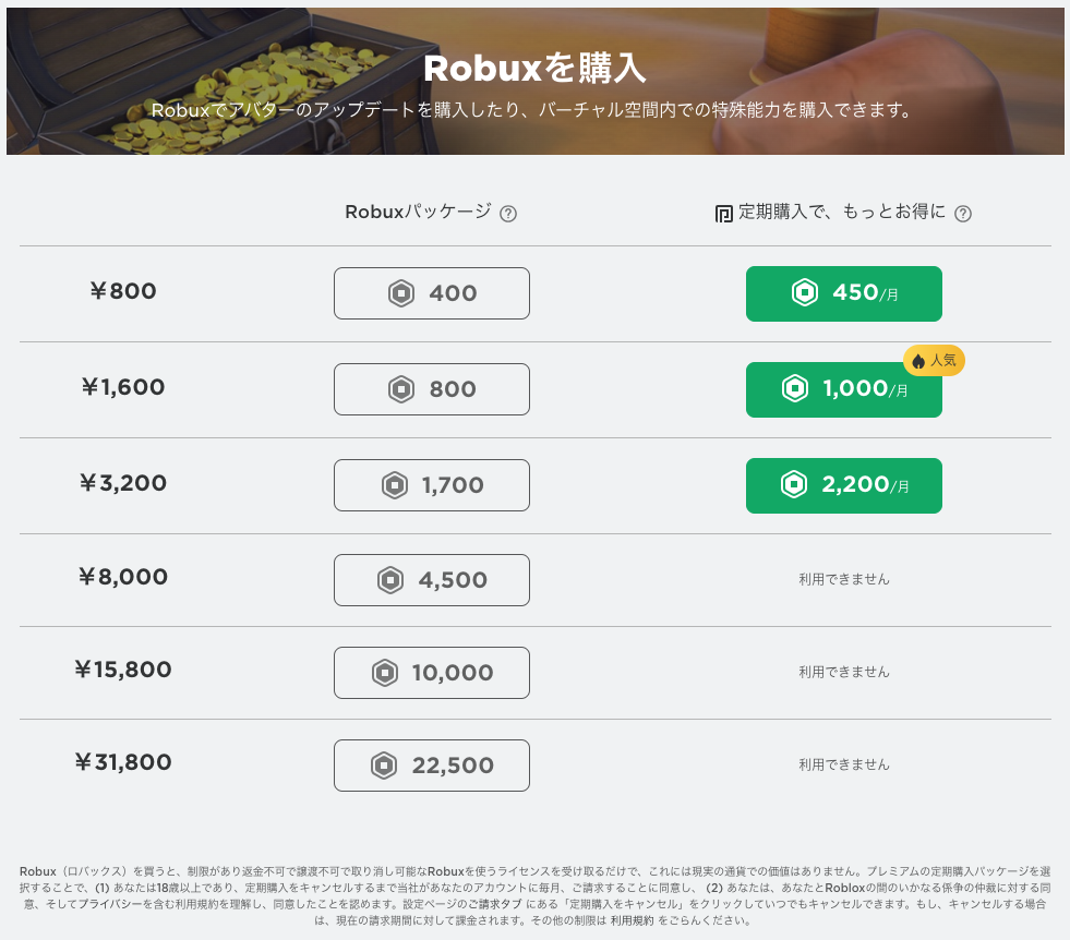 購入したいRobuxを選択して、購入します。サブスク定期購入の方が貰えるRobuxは多いです。
