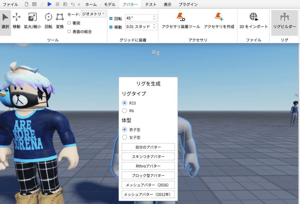 まずは、NPCをRobloxにだそう。[アバター]タブ→[リグビルダー]から、NPCになるアバターを出すことが出来るよ。リグタイプとは、アバターに使われているブロック数のことだよ。R6はレゴみたいな見た目で、R16はよりリアルな見た目になるよ。