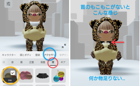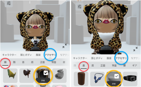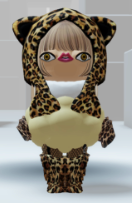 ヒョウ柄の帽子(アクセサリー:頭)と、中に着ている服を隠すための首のもこもこ(アクセサリー:首)を装備します。