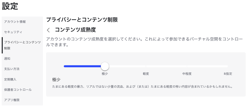 コンテンツの成熟度を変えることで、ログインできるバーチャル空間を指定できます。