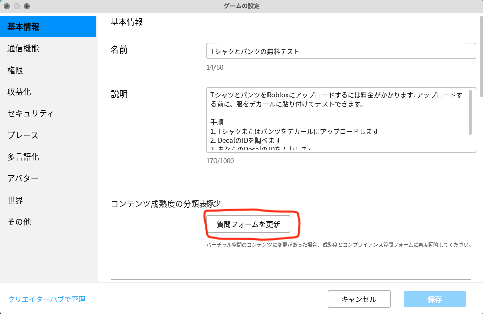 Roblox Studioの「ファイル」→「ゲーム設定」→基本情報にある、コンテンツ成熟度の分類表示から「質問フォームを更新」を選びます。質問フォームに回答していくと、作ったゲームの対象年齢が指定され、年齢に合った人がゲームにアクセスできるようになります。